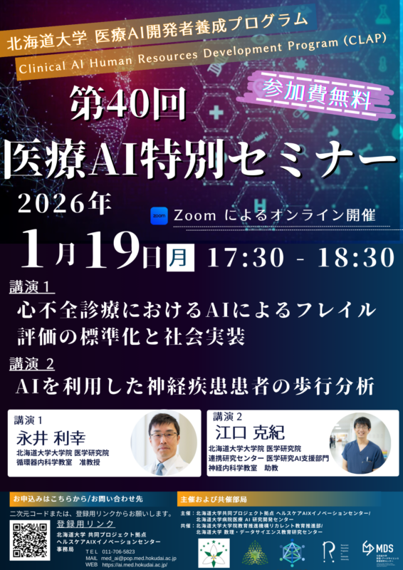 お知らせnews お知らせ一覧 2025.12.19 イベント トピック 2026年1月19日開催 医療AI特別セミナー(第40回) 2025.12.01 トピック 令和7年度 北海道大学の大学院生向け CLAPプログラム説明会(オンライン)の開催案内 2025.11.21 トピック 第28回 Hokkaido University-Seoul National University Joint Symposium Breakout Session を開催しました ご挨拶MESSAGE more 研究・教育RESEARCH & EDUCATION more スタッフstaffs more 実績一覧ACHIEVEMENTS more 連携COOPERATION more 医療AI研究開発センター 医療AI開発者養成プログラム お問い合わせ