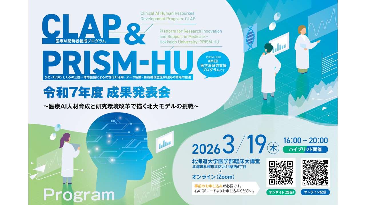 お知らせnews お知らせ一覧 2026.02.20 イベント 2026年3月19日開催 北海道大学CLAP & PRISM-HU 令和7年度 成果発表会 2026.02.06 トピック 文部科学省 保健医療分野におけるAI研究開発加速に向けた人材養成産学協働プロジェクトの事後評価結果について 2026.01.07 トピック 2026年1月26日(月)【ハイブリッド開催】Neuroimaging & AI Winter Seminar in Sapporo ご挨拶MESSAGE more 研究・教育RESEARCH & EDUCATION more スタッフstaffs more 実績一覧ACHIEVEMENTS more 連携COOPERATION more 医療AI研究開発センター 医療AI開発者養成プログラム お問い合わせ