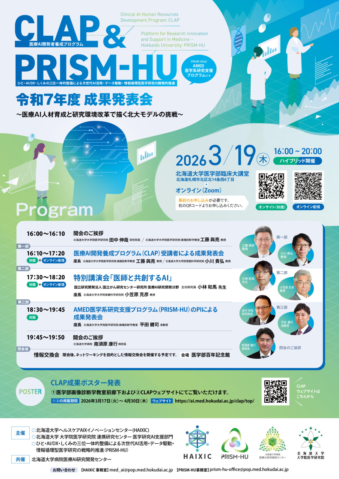 北海道大学ヘルスケアAIイノベーションセンター(HAIXIC)では、Clinical AI Human Resources Development Program(CLAP)およびPlatform for Research Innovation and Support in Medicine Hokkaido University(PRISM-HU)の令和7年度成果発表会を開催いたします。